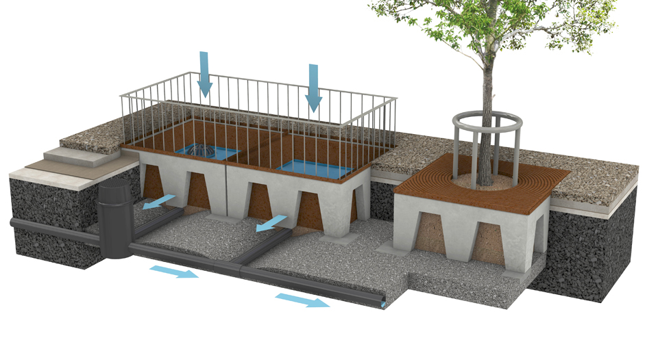 En lösning är att använda regnbäddar som fungerar som lagring och fördröjning av dagvatten. Vattnet hinner då filtreras eller rinna bort i lagom takt utan att det orsakar översvämningar.Kombinationen trädgropsfundament, trädgropsram och markgaller tar skonsamt emot punktlasterna vid trädets rot zon.