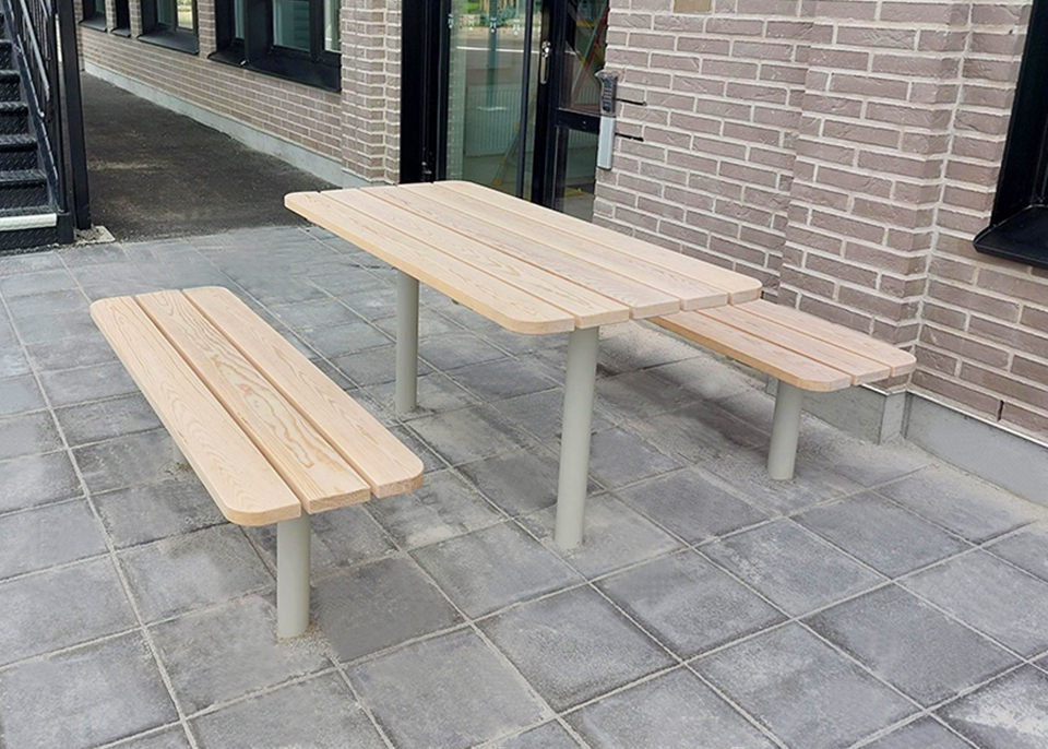 Levereras med färdigmonterade bordsskivor, sits element och stolpben för enkel montering