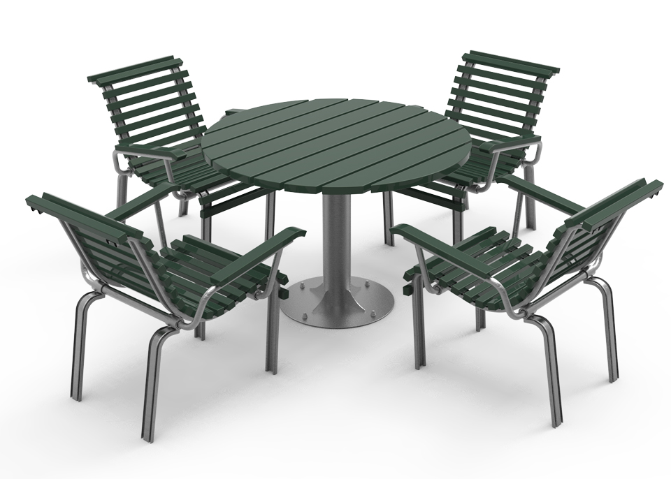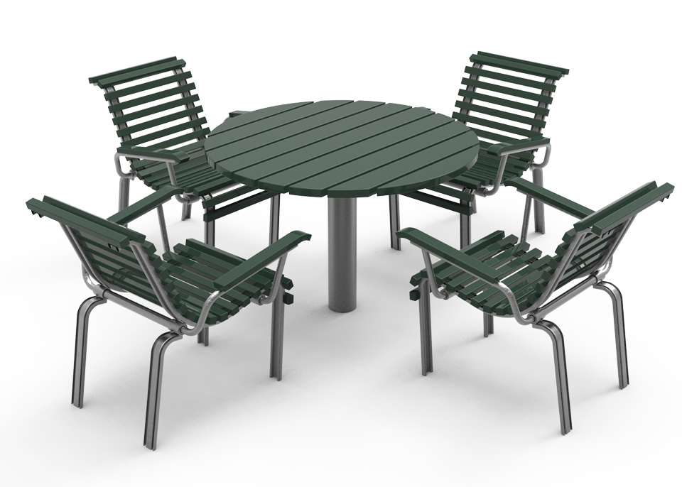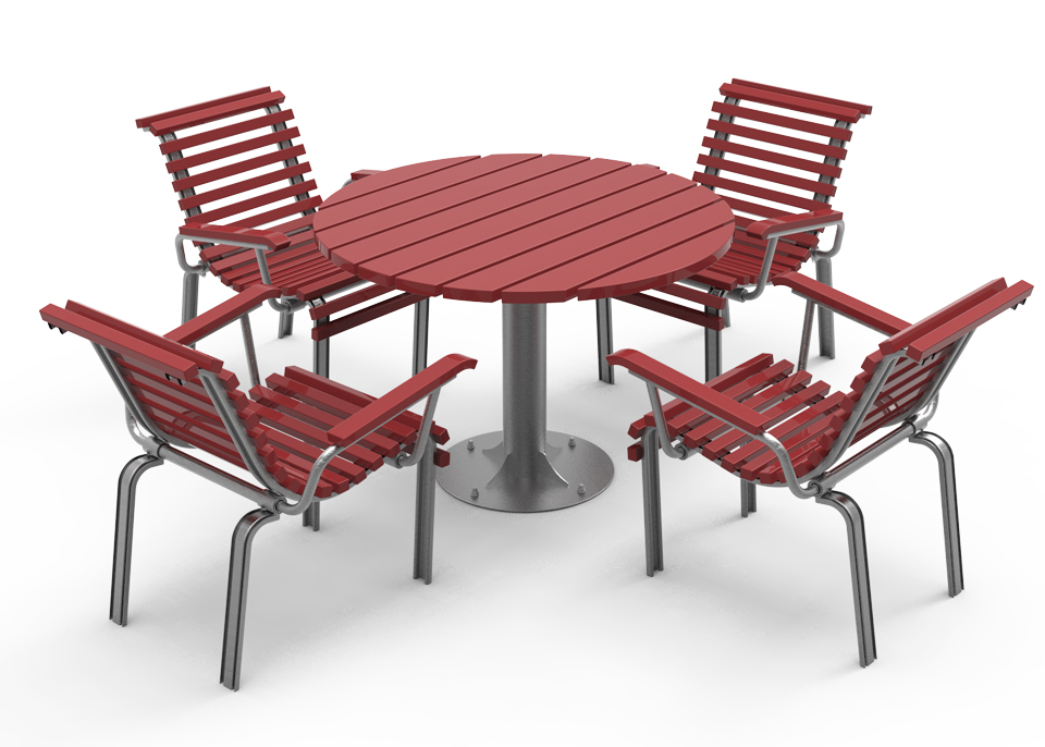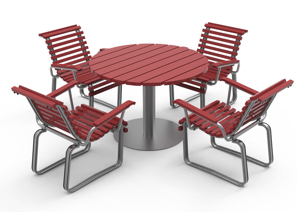 Levereras med färdigmonterade bordsskivor, sits element och stativ, stolpben och medar för enkel montering