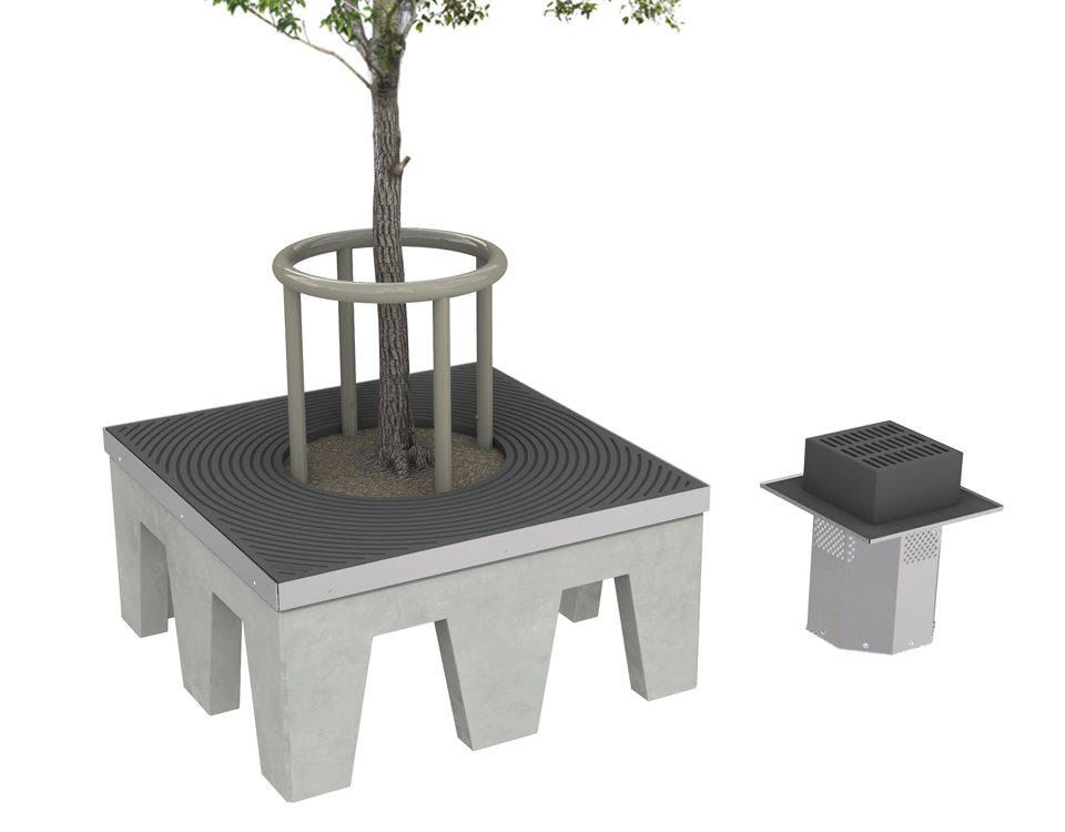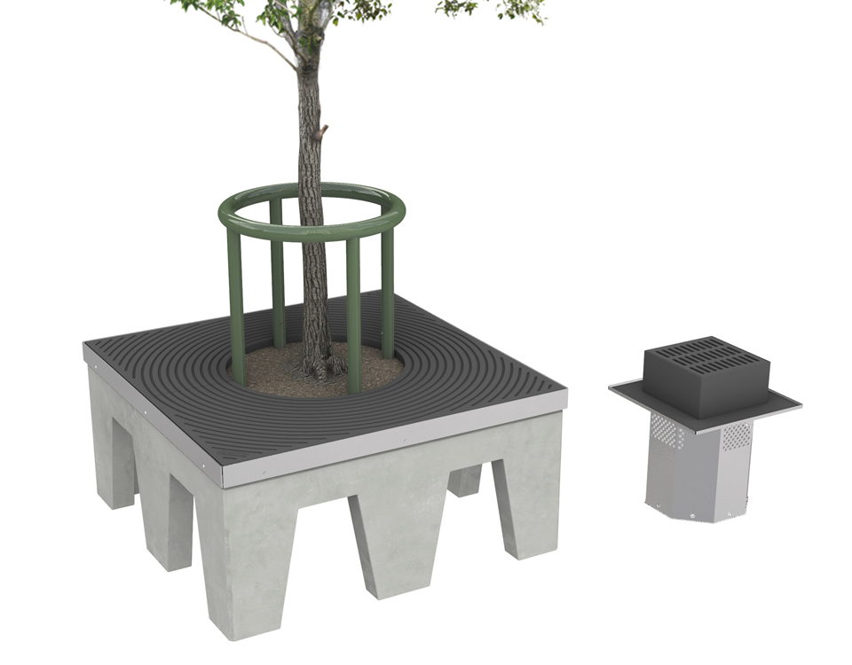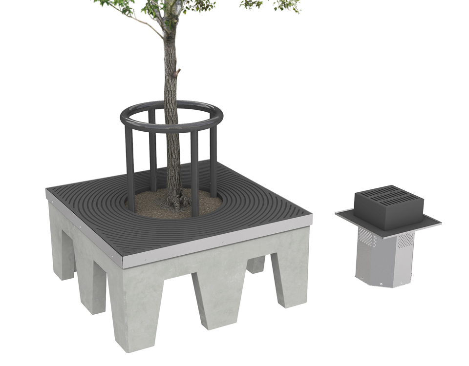 - Kombinationen trädgropsfundament, trädgropsram och markgaller tar skonsamt emot punktlasterna vid trädets rot zon.